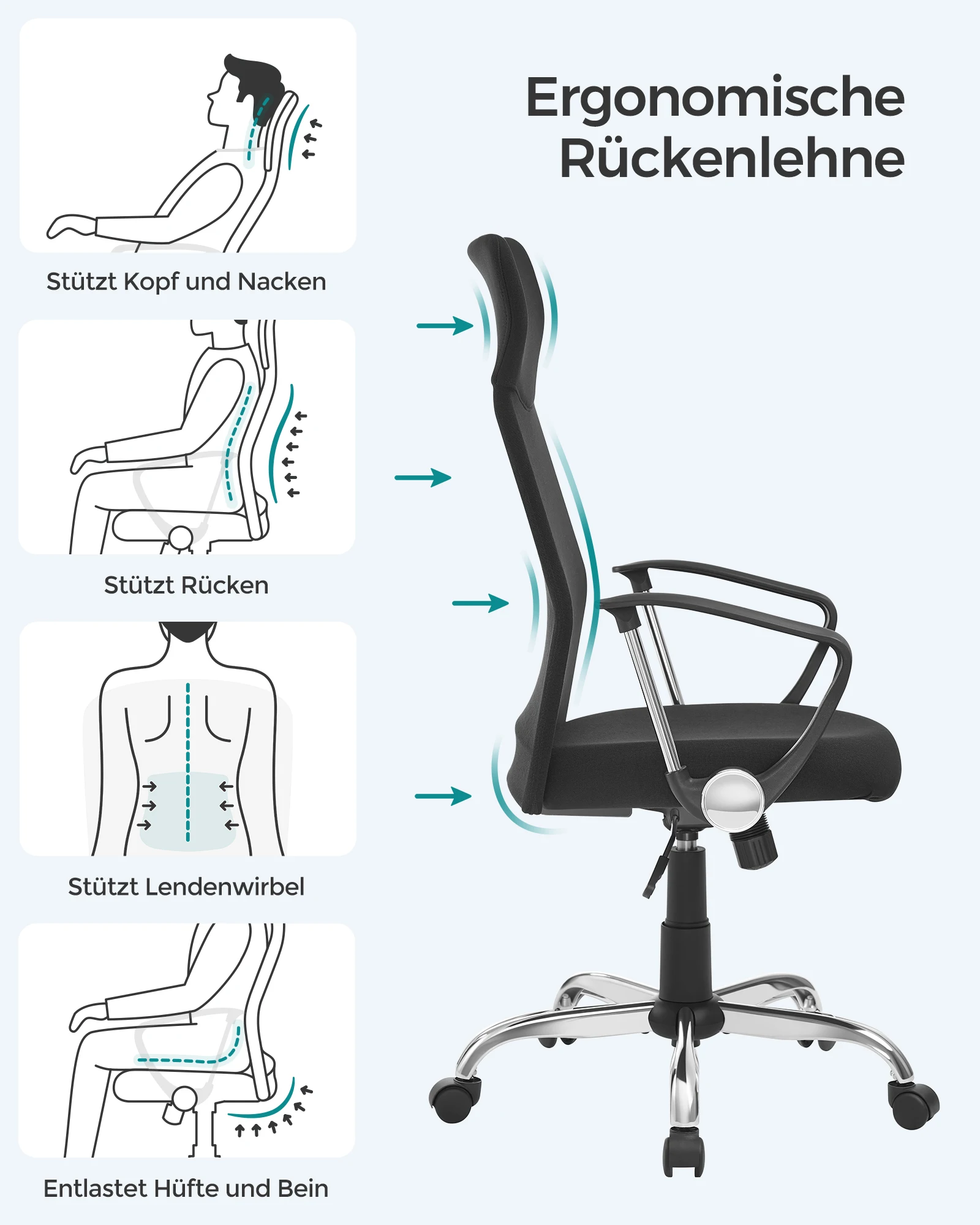 - Reduces neck and back strain for healthier sitting.